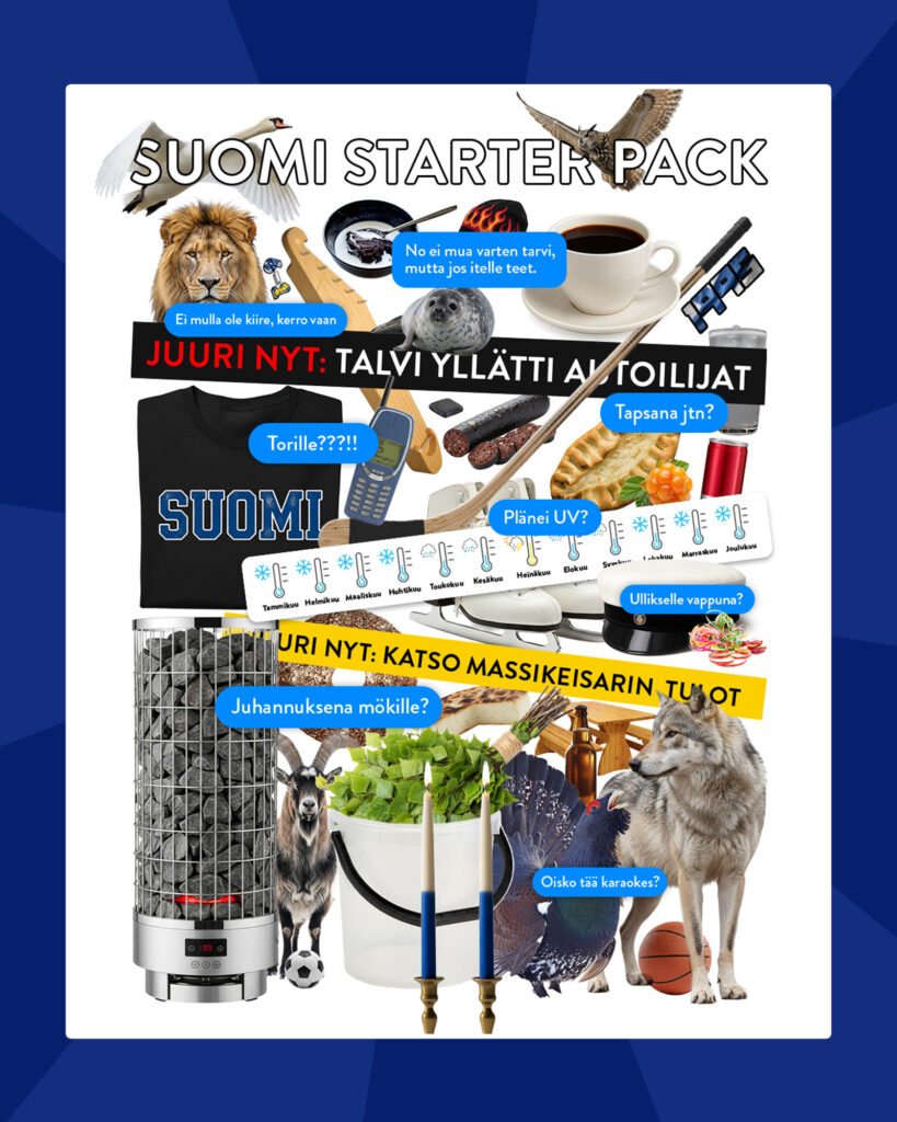 Yleisöäänestyksen voittajaksi nousi Suomi Starter Pack -meemi, joka hurmasi äänestäjät osuvalla kokoelmallaan suomalaisuuden tunnusmerkkejä. Meemi kiteyttää humoristisesti arjen ilmiöt, asenteet ja esineet, jotka suomalaiset tunnistavat välittömästi – juuri siksi se nappasi ansaitusti Suomen suomalaisimman meemin tittelin!