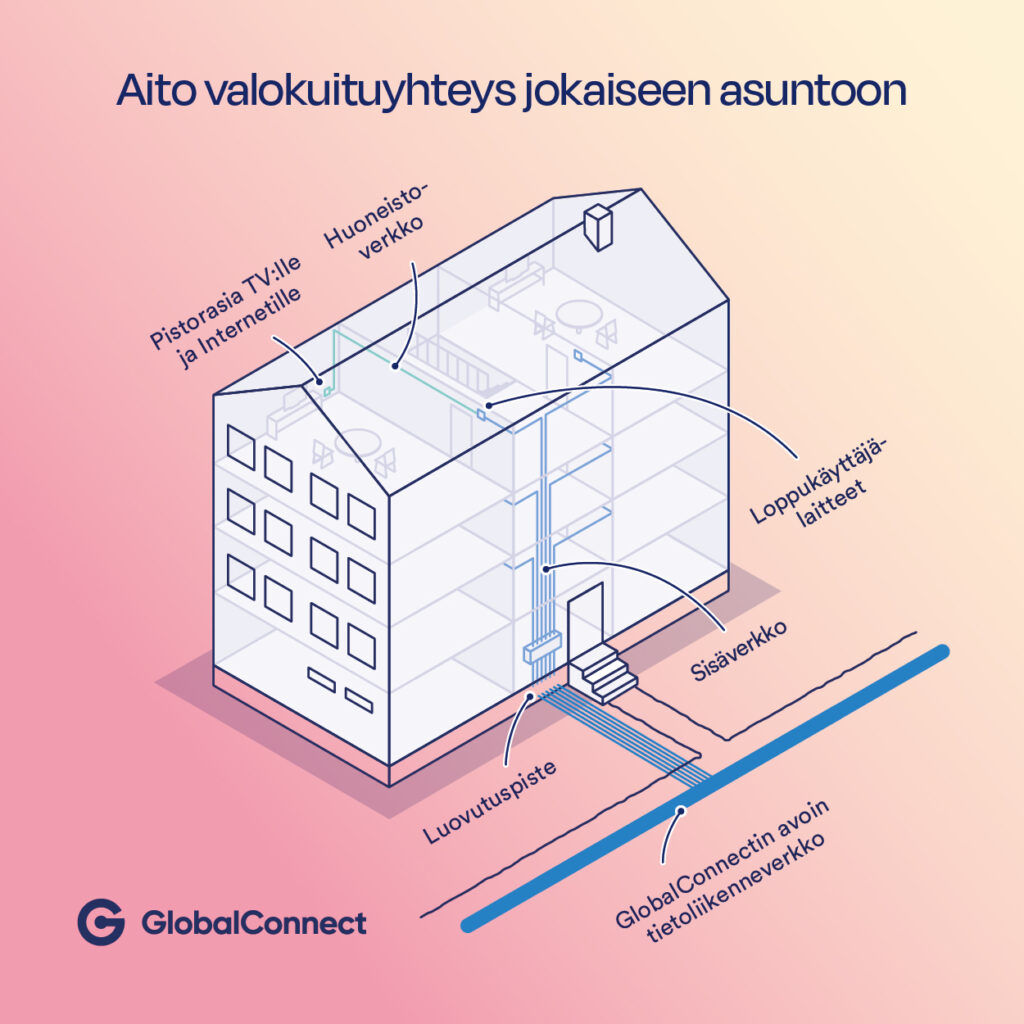 Omakotitalojen lisäksi myös taloyhtiöt voivat tilata valokuituliittymän. GlobalConnect tarjoaa valokuituyhteyden taloyhtiön jokaiselle asunnolle. Vanhempien kerrostalojen kupariset sisäverkot uusitaan viestintäviranomaisten määräysten mukaisesti valokuituyhteyksiksi. Tämä takaa häiriöttömän ja vakaan internetyhteyden jokaiselle huoneistolle. Rivitaloissa valokuitu voidaan asentaa suoraan jokaiseen huoneistoon, jolloin kyseessä ei ole kiinteistön sisäverkko, vaan suora operaattorin yhteys huoneistoon.