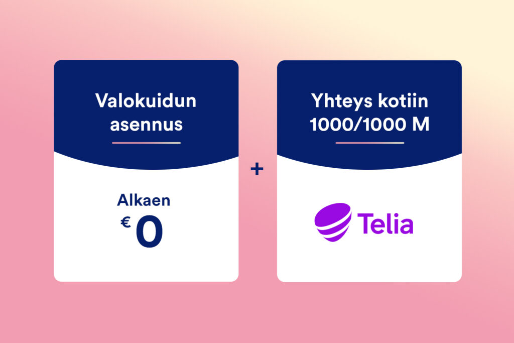 * GlobalConnect -valokuituliittymä 0 € (norm. 2000 €) ja Telia Yhteys kotiin Valokuitu 1000/1000M –liittymä hintaan 24,90 €/kk 12 kk ajan. 12 kk määräaikainen sopimus, sopimuskauden kokonaishinta 298,80 €. 12 kk määräaikaisen tilausjakson jälkeen liittymän tilaus jatkuu toistaiseksi voimassa olevana hintaan 54,99 €/kk tai hinnaston mukaisella hinnalla. Liittymän arvioitu maksiminopeus 1000 Mbit/s. Tiedonsiirron nopeus sekä nopeuden vaihtelu riippuu mm. laitteen ominaisuuksista sekä verkkotekniikasta. Saapuvan liikenteen nopeus 500-1000 Mbit/s ja lähtevän liikenteen nopeus 500-1000 Mbit/s. Palvelun saatavuus, hinnat ja nopeudet voivat vaihdella alueittain. Reititin sisältyy sopimukseen. Etupaketti tilattavissa 31.12.2025 saakka kampanja-alueilla.